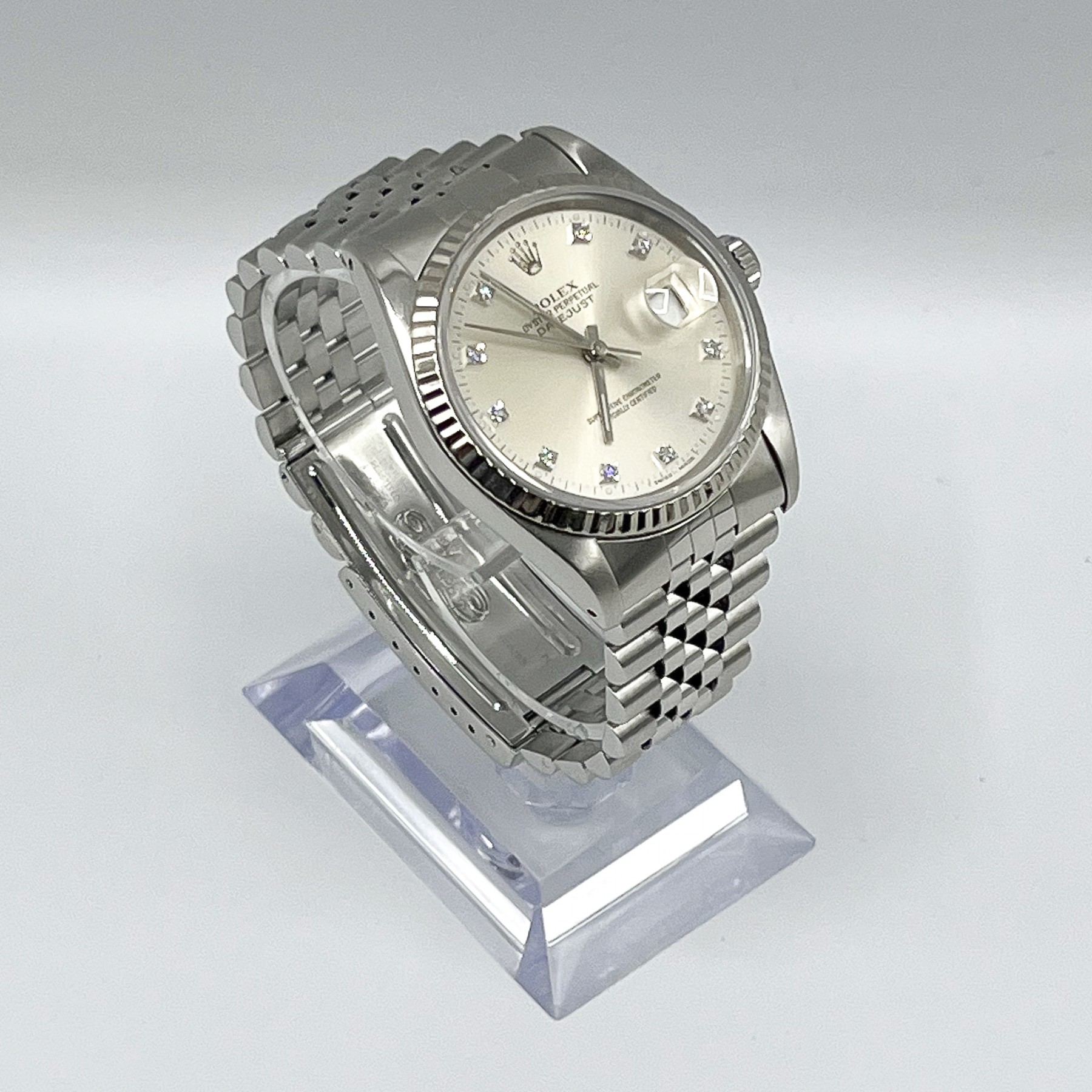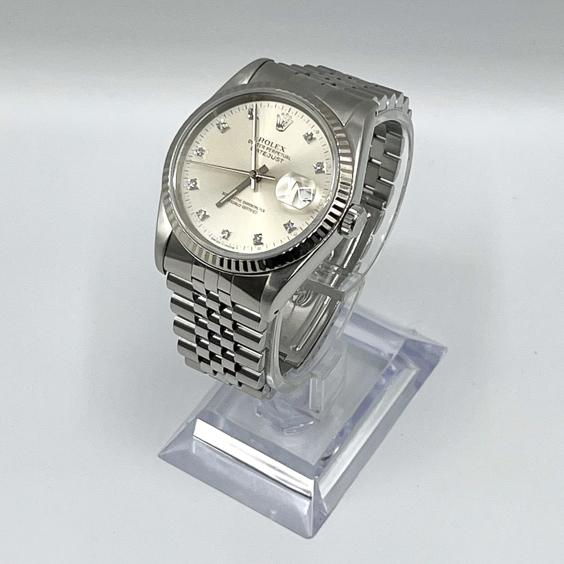 Rolex modello Datejust ref. 16234 con cassa e bracciale jubilee in acciaio, ghiera zigrinata in oro bianco - Quadrante color argento con brillanti al posto degli indici - Ore, minuti e secondi al centro, datario alle ore 3 - Chiusura deployante - Diametro 36 mm - Movimento a carica automatica - Corona a vite, vetro zaffiro, impermeabile fino a 100 m - Completo di scatola e garanzia originali Rolex - Anno di produzione 1991 - Mai lucidato. Il funzionamento è stato accuratamente verificato e, per questo motivo, rilasciamo una garanzia del nostro negozio, della validità di un anno